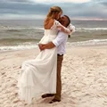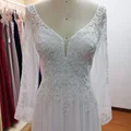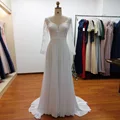 Hot Sale Real Photo Wedding Dresses Cheap Long Sleeves Chiffon Beach Bridal Dress Backless V Neck Lace Appliques A Line Wedding Gown