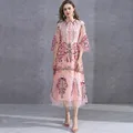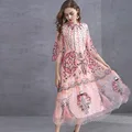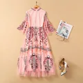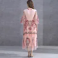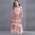 Sale 2021 Long Dress Spring Summer Dress Mid Calf 3/4 Sleeve Empire Lapel Neck Flora Print Fashion Dress Embroidery Pink